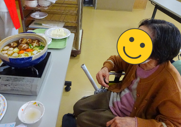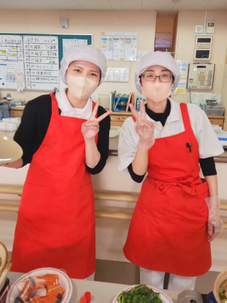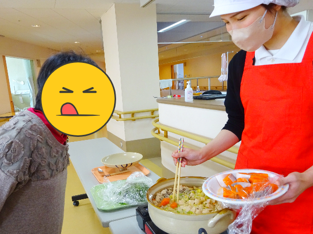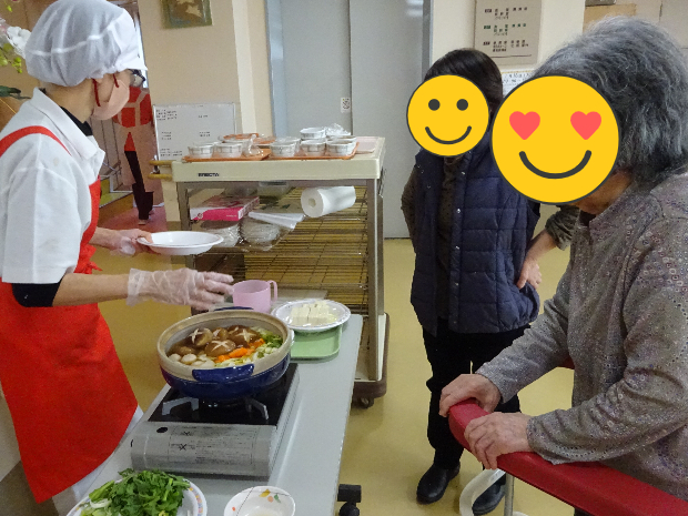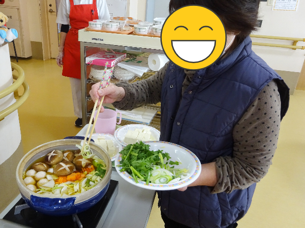 新着情報 NEWS 2024 鍋!!| 介護老人保健施設 辰巳ナーシング・ヴィラ 2024.01.13 2024年!! 新年一発目の美味しい行事は「鍋会」。お昼ご飯に温かいお鍋をいただきました。毎年恒例のこの行事。でも毎年同じお鍋ではありません。おでんの時もありました。さて、今年のおなべは何鍋になったのでしょう! フロアに具材、お鍋、コンロを持ち込み、目の前で仕上げてくれる「ライブキッチン」です。 お手伝いしてくださる方大歓迎! ご自宅にいたときを思い出していただきつつ、具材を投入! 「具材は何かしら?」美味しい匂いに誘われて、入れ替わり立ち代わりライブキッチンを覗きにいらっしゃる方々( *´艸`)そりゃいい匂いがしたら覗きに来たくなっちゃいますよね♪ 「さて、今日のお鍋はなに鍋かわかりますか? ヒントはいま私が入れようとしているのは『鮭』ということです」 正解は『石狩鍋』でした!! 写真には鮭が映ってませんがちゃんと入ってます! この丸いのは『カニつみれ』です。その他、白菜、大根、椎茸、花人参、豆腐、春菊と具沢山の石狩鍋の出来上がり~!! お鍋のほかに散会では『おじや』を作ってます。もちろん、ライブキッチンで(*‘∀‘)♪ お手伝いいただいたご入所者様には卵を割っていただきました。お久しぶりの卵割に少しドキドキです。 割っていただいた卵をおじやに回しかけます。 こちらでも卵を割って混ぜていただきます。 そしておじやに入れます。さすが!! 手つきが料理をやってきた人の手つきですね。 出来立てをちょっとお味見♡ みんなには内緒。こっそりこっそり。「いかがですか?」「うん、すごくおいしい!」 最後にネギを加えて…はい! 美味しいおじやの完成です。たくさんありますからお替りしてくださいね~(^^)/ お鍋も完成し、さっそく盛り付けです。いろんな具がまんべんなく入るよう盛り付けます。 ご覧ください! 美味しそうな石狩鍋の完成です。皆さんどうぞ召し上がれ~♪ さっそく鮭からいただきま~す!! 温かいおじや…慎重にフーフーフー。用心して口へ♡ 柔らかいごはんではなく、普通のごはんの方へは『ゆかりご飯をご提供させていただきました。』 フロアいっぱいに美味しい匂いが広がり、だいぶ皆様のおなかを刺激したのではないでしょうか。おじやをお替りされる方もおり、皆さん大変満足されていらっしゃいました。おなか一杯召し上がり、リハビリするパワーをチャージいたしました!! 一覧に戻る