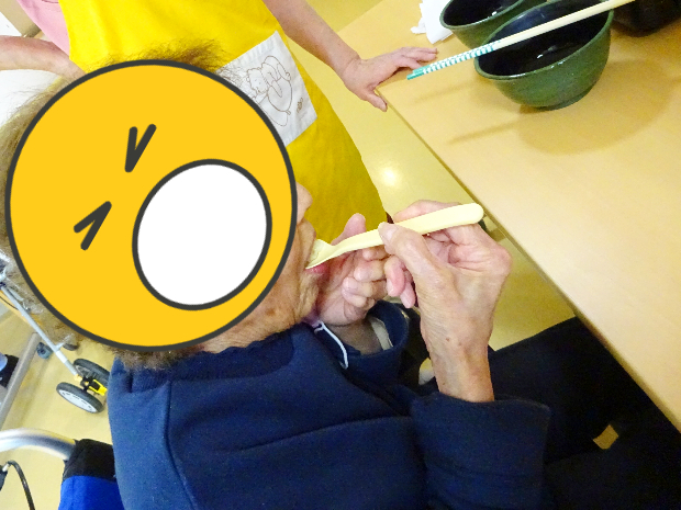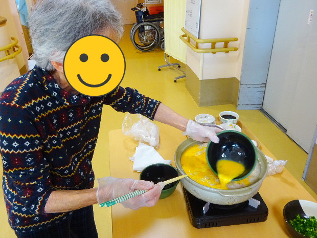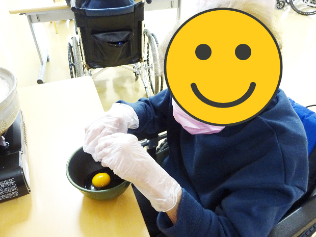お手伝いいただいたご入所者様には卵を割っていただきました。お久しぶりの卵割に少しドキドキです。