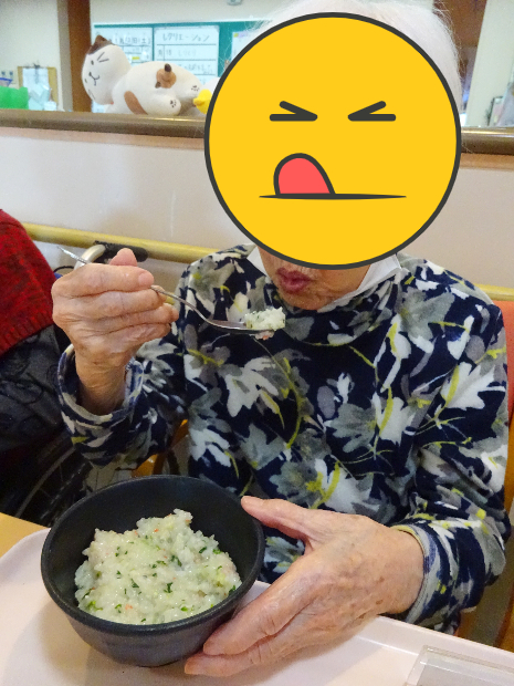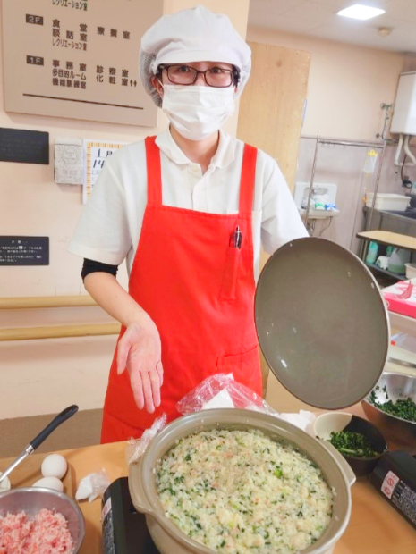 フロアいっぱいに美味しい匂いが広がり、だいぶ皆様のおなかを刺激したのではないでしょうか。おじやをお替りされる方もおり、皆さん大変満足されていらっしゃいました。おなか一杯召し上がり、リハビリするパワーをチャージいたしました!!