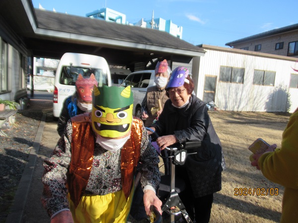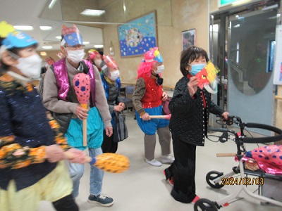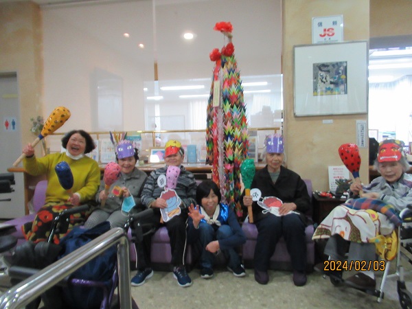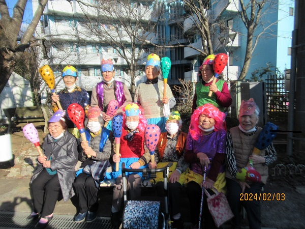 彩風苑では、入居者様が鬼に変身して、食堂でゲームを楽しみ、いざ出陣!!