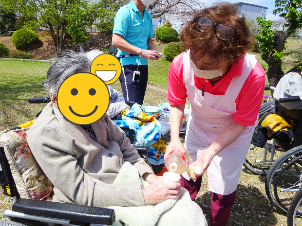 体の中にも春を取り入れました! 暖かい日も多くなり、天気の良い日には施設前に散歩に出るなどしています。今の子の気持ちの良い空気を肌でたくさん感じていただき、この春の季節を十分お楽しみいただきたいなと思っております。