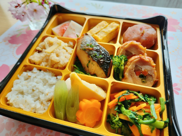 そしてこちらは栄養科特製「お花見弁当」です。シラスごはん、たけのこごはん、桜おはぎ、鰆の木の芽焼き、チキンロール、具沢山煮もの、厚焼き玉子、菜の花のお浸し、牛乳寒天苺ソースかけの9品。汁物は生麩としめじの澄まし汁。