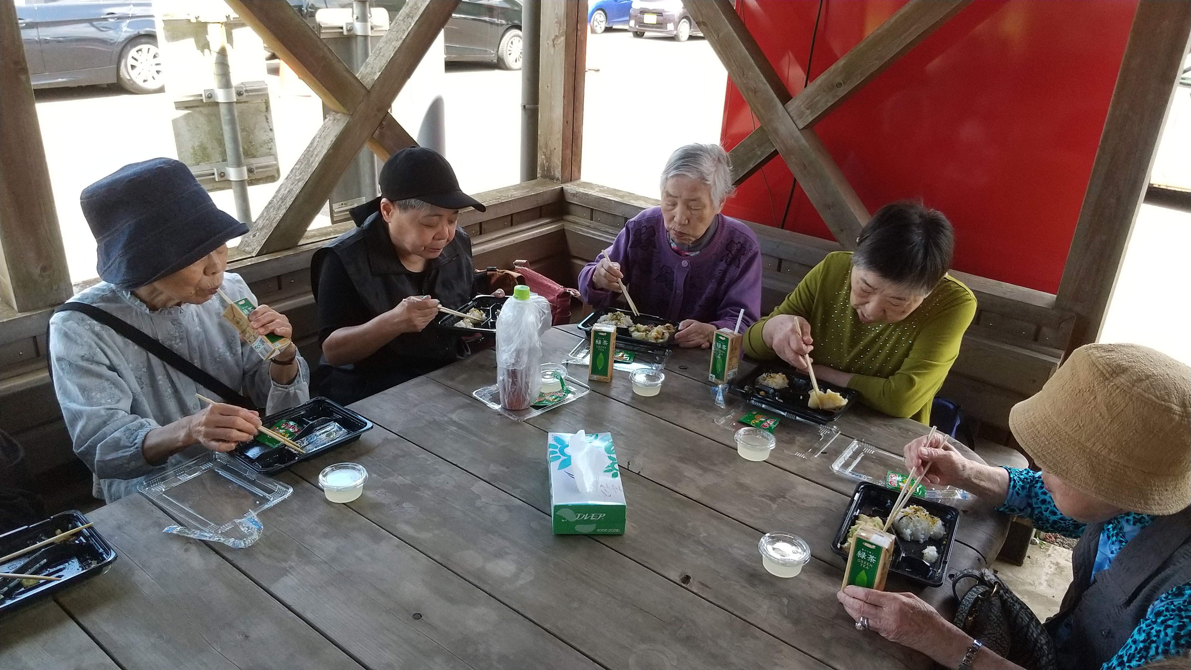 4/25、さとにわ耕園にピクニックに行きました。お天気にも恵まれ、まず、着いたらお弁当を食べました。入り口近くのログハウスで食べました。