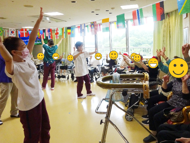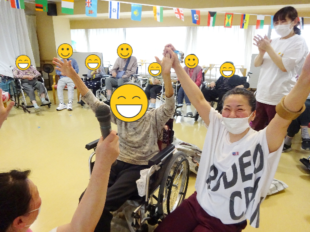 ヴィラ入所の方々と毎年恒例の「ヴィラ運動会」を開催いたしました‼ 2階、3階へご入所されている方々が4階フロアへ集まり額にハチマキし体を動かしました!