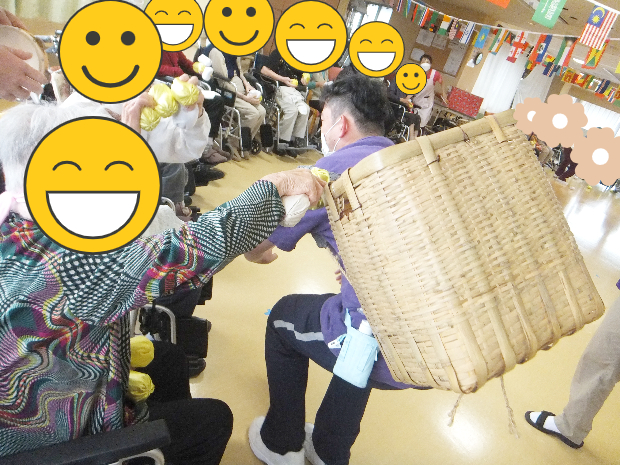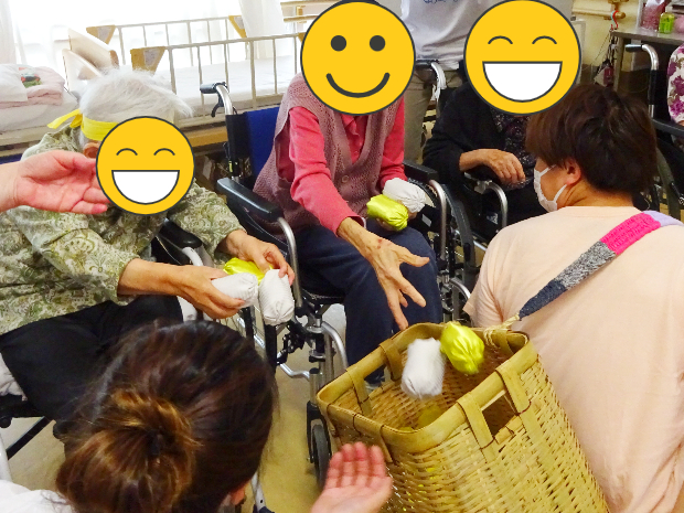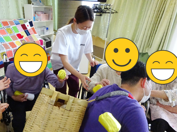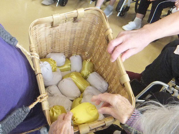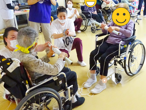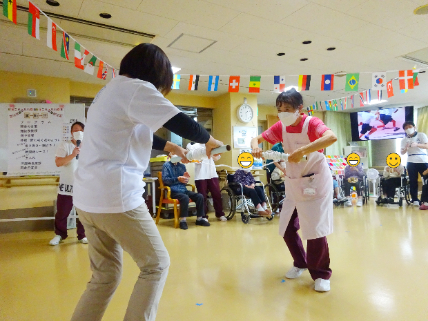 新着情報 NEWS 2024 運動会 (入所)| 介護老人保健施設 辰巳ナーシング・ヴィラ 2024.06.09 2024年6月某日 ヴィラ入所の方々と毎年恒例の「ヴィラ運動会」を開催いたしました‼ 2階、3階へご入所されている方々が4階フロアへ集まり額にハチマキし体を動かしました! まずは「野に咲く花のように」の曲に合わせて慣れ親しんだ体操で体を伸ばして運動の準備です。 それでは「選手宣誓」です。選ばれしお二人に高らかに宣誓していただきました!! まず1種目目は「巻き巻き綱引き」です。ラップの芯にまかれた紐を互いに高速で巻き、どちらが早く半分以上まくことができるかの勝負です。 それ!がんばれ! がんばれ! 思いのほか長い紐!! 勝負となると絶対勝ちたいという気持ちが高まります。 こちらのご入所者様も一生懸命巻きます! 近年こんなにも紐を巻いたことはあったでしょうか。でも手首を動かし、勝利に向かって巻いていきます!! 勝利~!! やりました!! 勝負を制しました!! 一生懸命戦って勝った時の喜びはひとしおです。思わず喜びを体で表現してしまいますよね(^^) ご入所者様方の勝負の後は、施設長(左)VS 看護師長(右)の頂上対決です。御覧の通りお互い一歩も引かない真剣勝負です。 周りで観戦しているご入所者様たちは、手にタンバリンや鈴をもって応援!!さてさて、この頂上対決、どちらが勝ったのでしょうか。 今年は、わずかな差で施設長が勝利を収めました! 白熱した接戦に大変盛り上がり!! 続きまして第2競技は「新聞ダッシュ」です。これは、長くつなげた新聞紙を足で手繰り寄せ、早くすべての新聞を手繰り寄せたほうが勝ちという競技です。靴を履いたままでも裸足でもOKです。こちらのご入所者様は裸足でやる気満々です! 早く新聞を手繰り寄せるには早く足を動かさなくてはいけません。そのためには体のバランスも大事です。椅子のひじ掛けをしっかり掴んでいざ勝負!! 一歩一歩しっかりと自分に寄せて、着実に勝つため、皆さん大奮闘!! 周囲の皆さんに応援していただくと、俄然力が湧いてきます。頑張れ!頑張れ! 勝ちましたーーー!! 勝った喜びはいくつになっても素直に体に出ます。ばんざーい!!嬉しいーー!! 応援している周りの方々も勝負がつくと歓声が上がります! 競技も楽しいですが応援もとても楽しく盛り上がってます!! さて、競技はいよいよラスト。全員参加の「玉入れ」です。一人一人に玉が配布され、協議開始の合図を今か今かと待っています。試合前の緊張漂う時間です。 よ~い、スタート!! 始まりました!! カゴを背負ったスタッフが目の前に来たら、狙いを定めて玉を投げ入れます。よ~く狙って!狙って! ようやく自分の前に来たら手持ちの玉を全部入れたくて入れたくて、思わず前のめり! 勢いがすごいっ!!!! スタッフも中腰お疲れ様です! でもまだまだ皆さん待ってます! スタッフも頑張れ! 頑張れ! やはり入れる喜びってありますからね。ほんのすこ~し甘めで入れやすい位置にカゴをセット・・・手に持っている玉、全部入れちゃいましょう!! 籠の中にはどんどん玉が入っていきます。段々と重くなっていきます。が! スタッフ根性で中腰で頑張りました!! 最後は数を数えて勝敗が決まりました。どちらのチームもたくさん入れることができて、勝敗はつきましたがどちらも満足!! 全員頑張った!! 頑張ったらお互いを讃えたくなっちゃいますよね。「頑張ったね」「楽しかったね」お互いを讃えて、労って、思わず握手♪ その日は運動会ということもあり、昼食は栄養科さん特製お弁当!!見た目に華やか♪ お稲荷さんにコロッケでお腹も大満足な一日でした!! 一覧に戻る