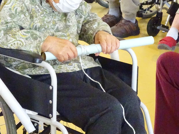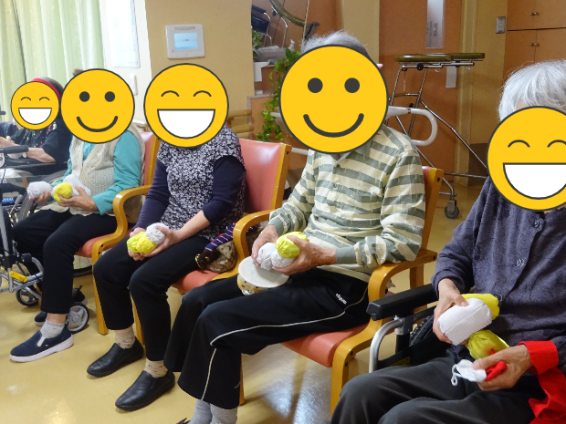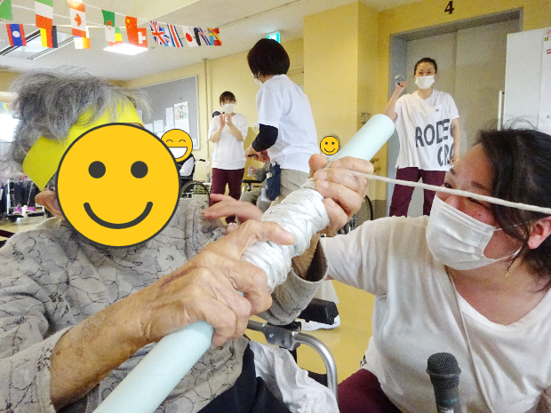 こちらのご入所者様も一生懸命巻きます! 近年こんなにも紐を巻いたことはあったでしょうか。でも手首を動かし、勝利に向かって巻いていきます!!