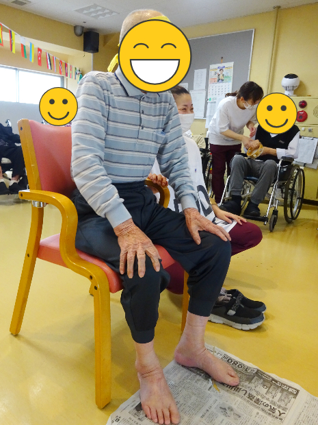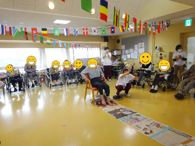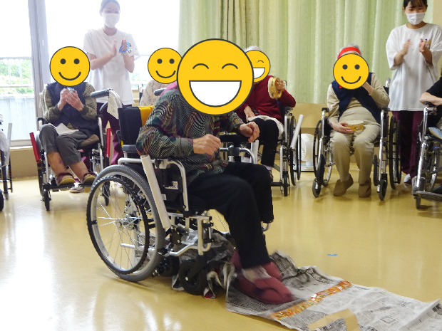 続きまして第2競技は「新聞ダッシュ」です。これは、長くつなげた新聞紙を足で手繰り寄せ、早くすべての新聞を手繰り寄せたほうが勝ちという競技です。靴を履いたままでも裸足でもOKです。こちらのご入所者様は裸足でやる気満々です!