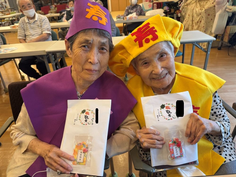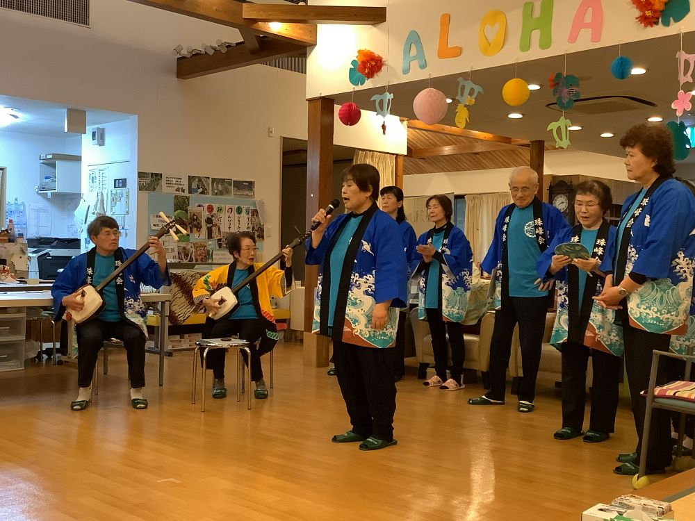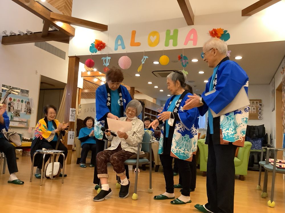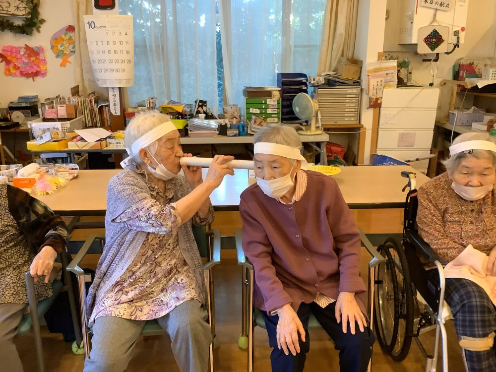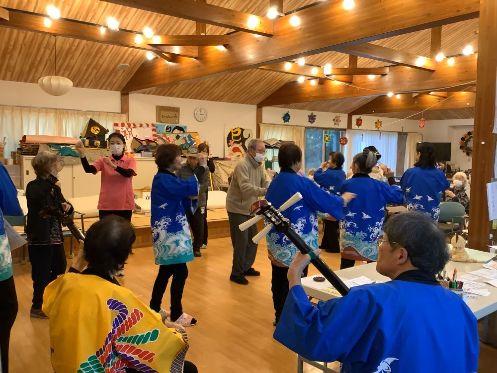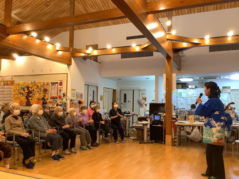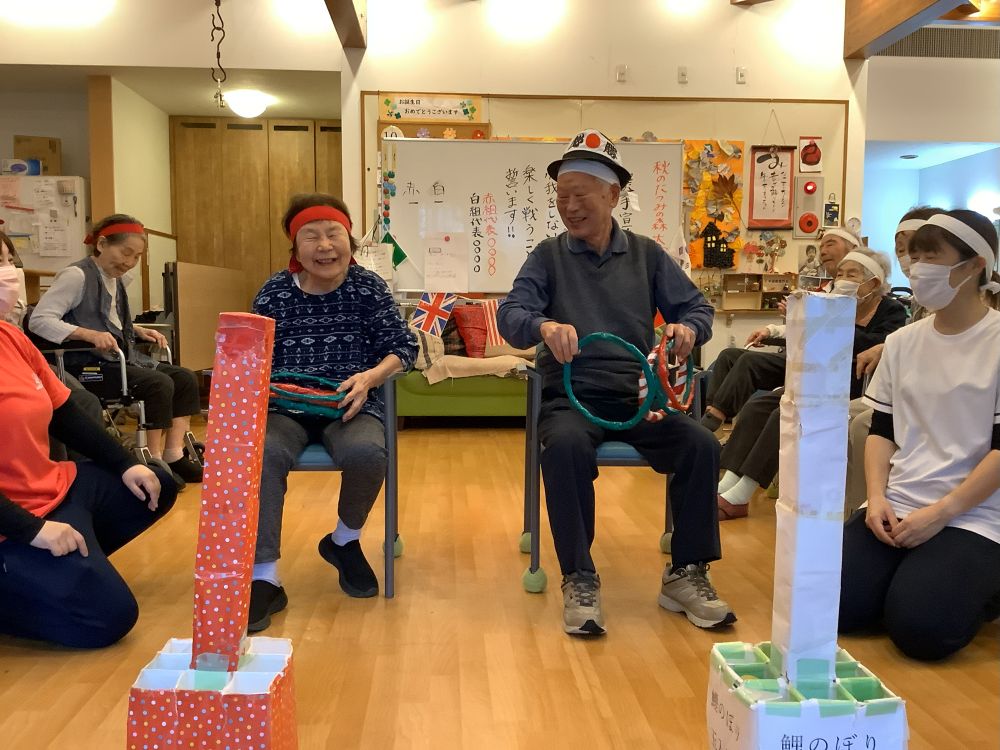 9月は『敬老週間』にて利用者様が末永くお元気で過ごされるように昼食にお赤飯を提供させていただきました。また、ささやかな贈り物をさせていただきました。10月には『秋の大運動会』を開催しました。選手宣誓から始まり輪投げやパン取り競争などを行いました。他にも、珠峰会様による『唄と三味線』が開催されました。三味線の生演奏や民謡、日本舞踊を披露してくださいました。最後には利用者様も一緒になって炭坑節を踊り楽しみました。