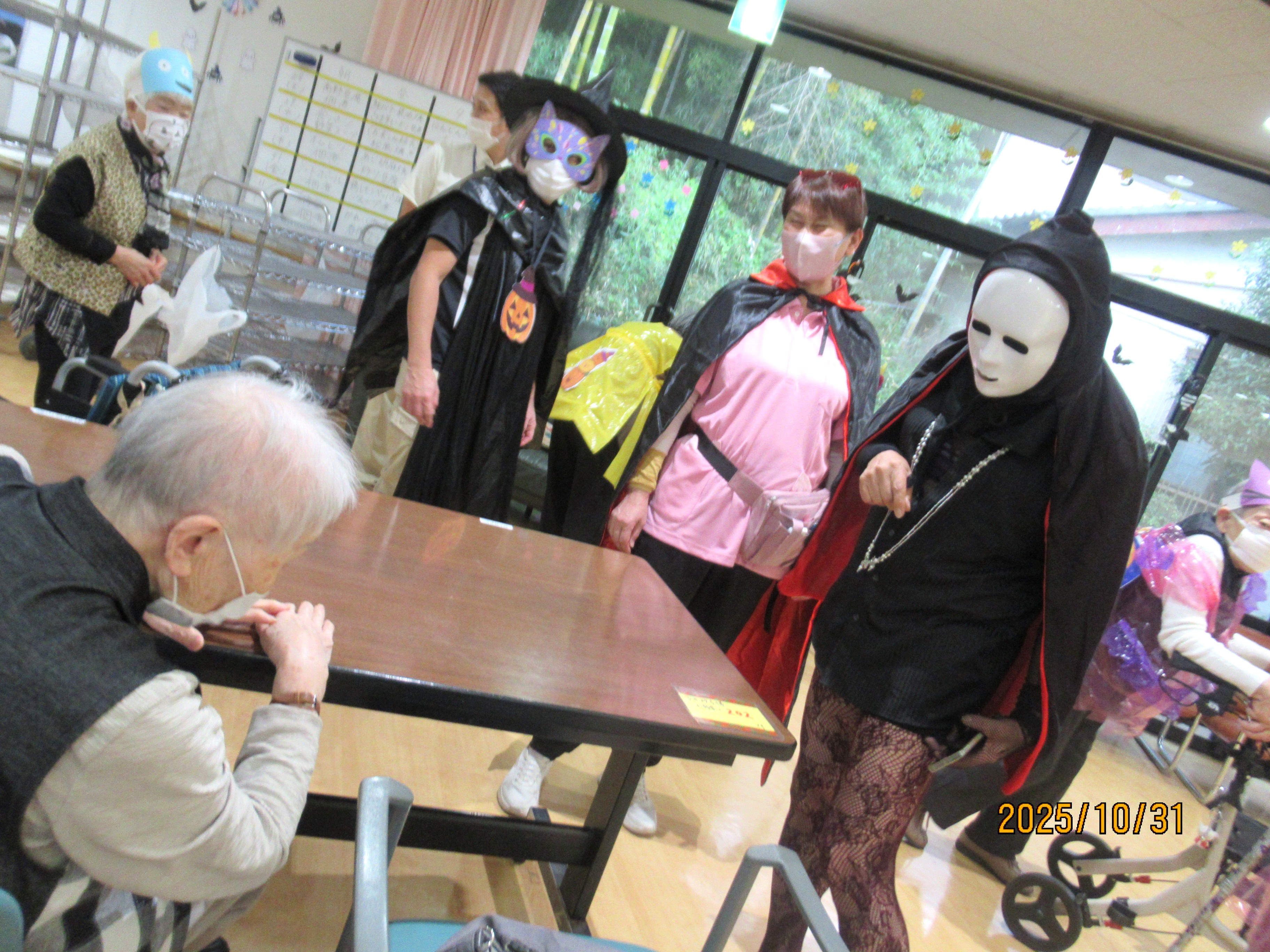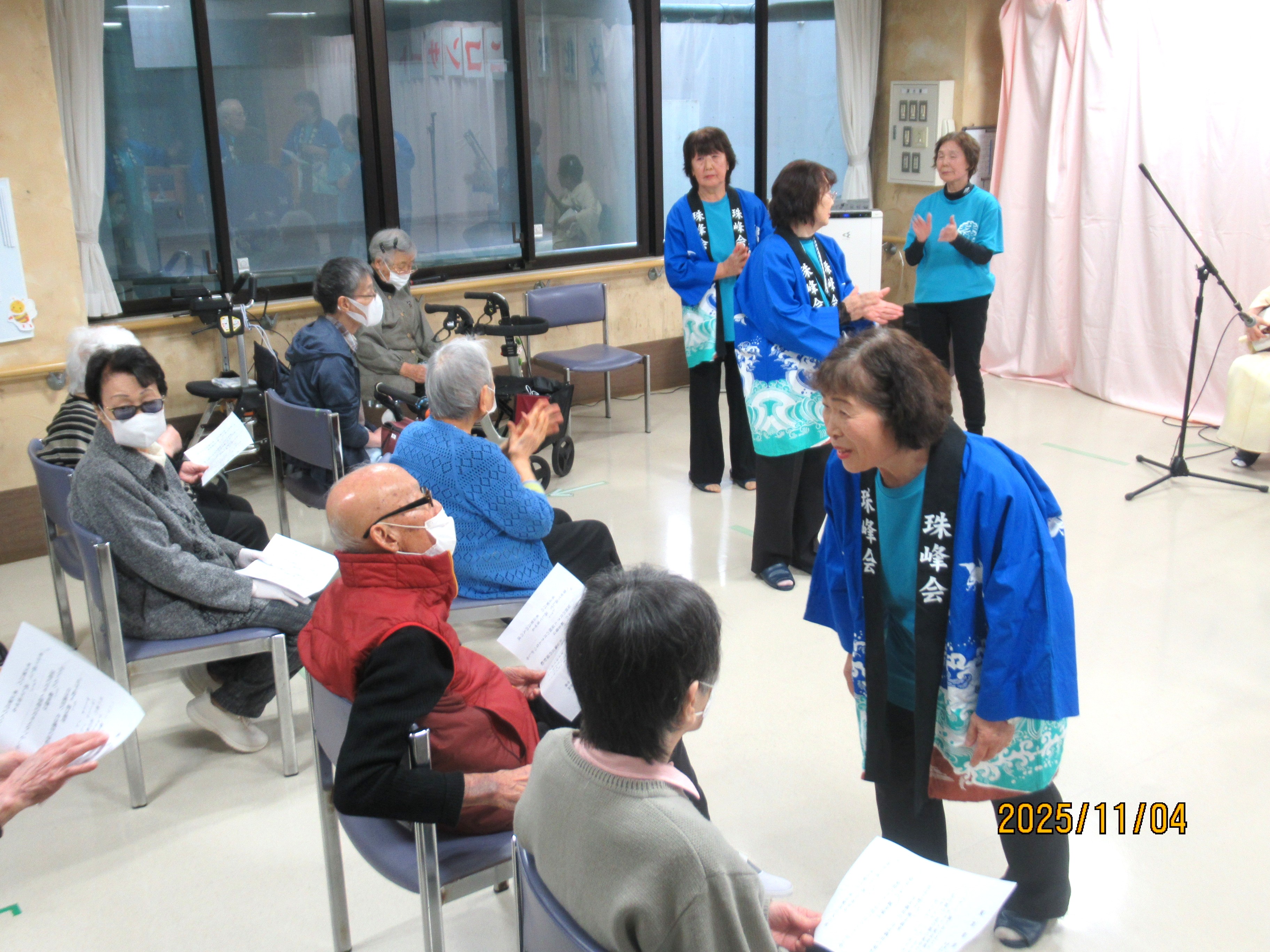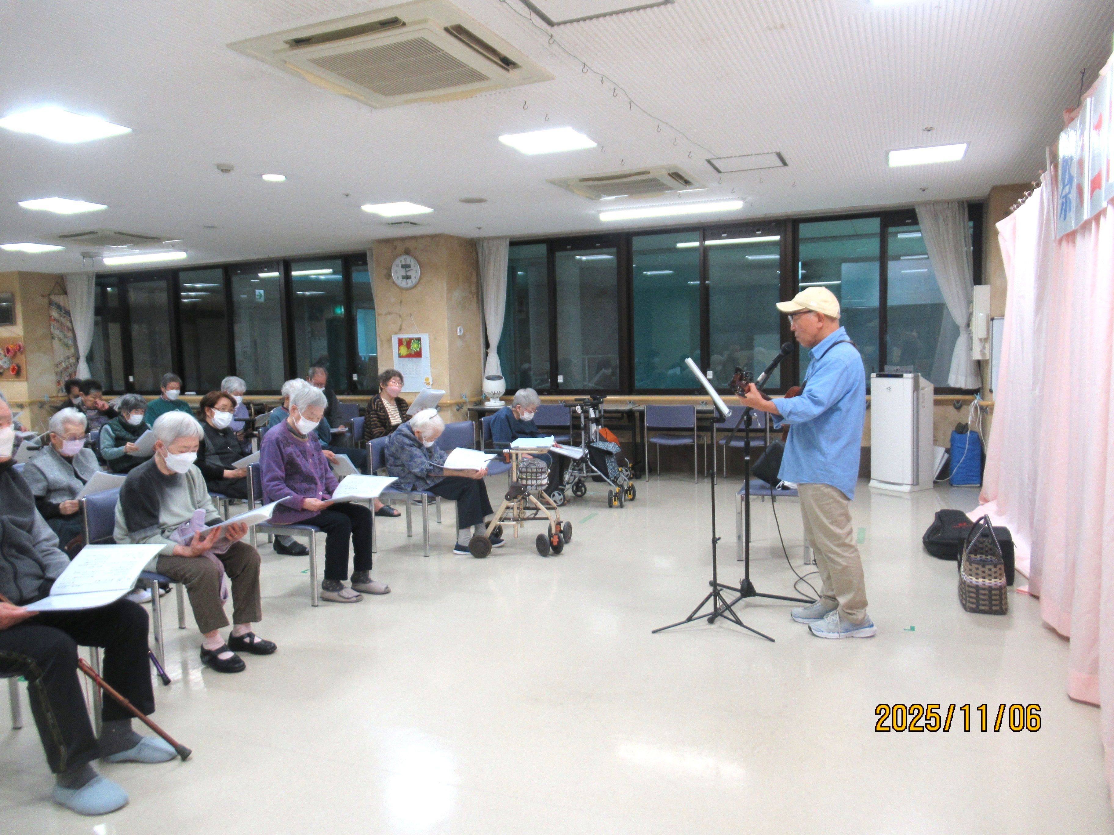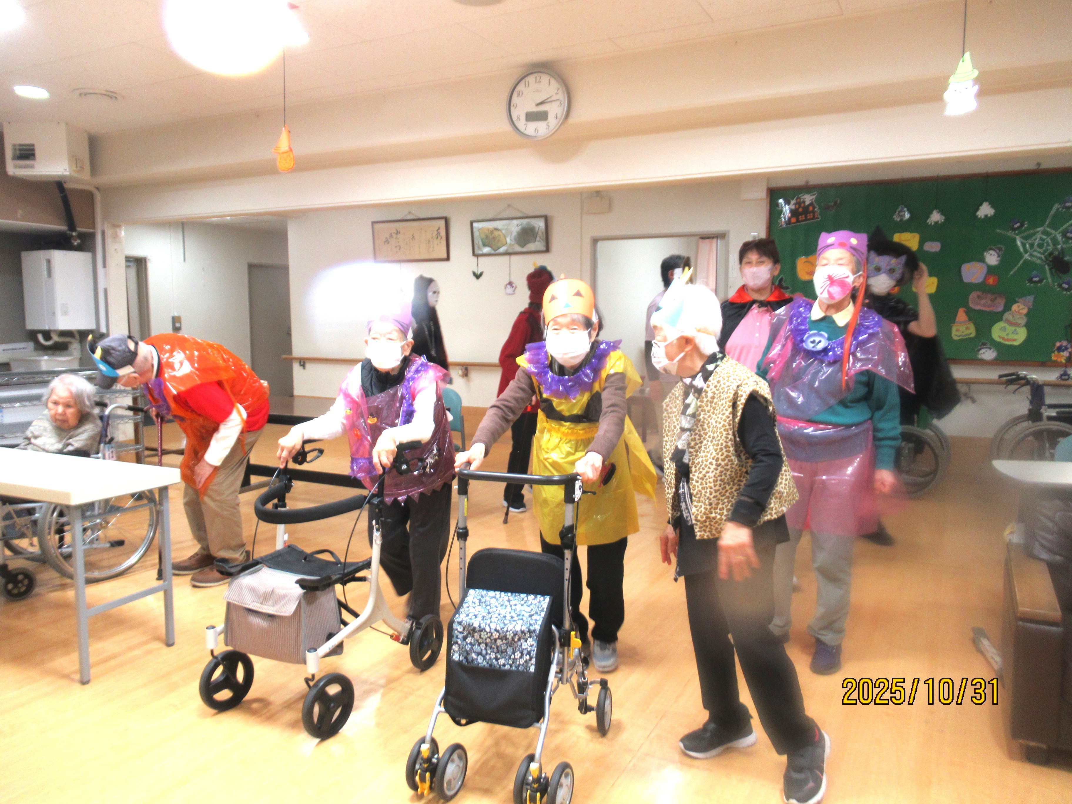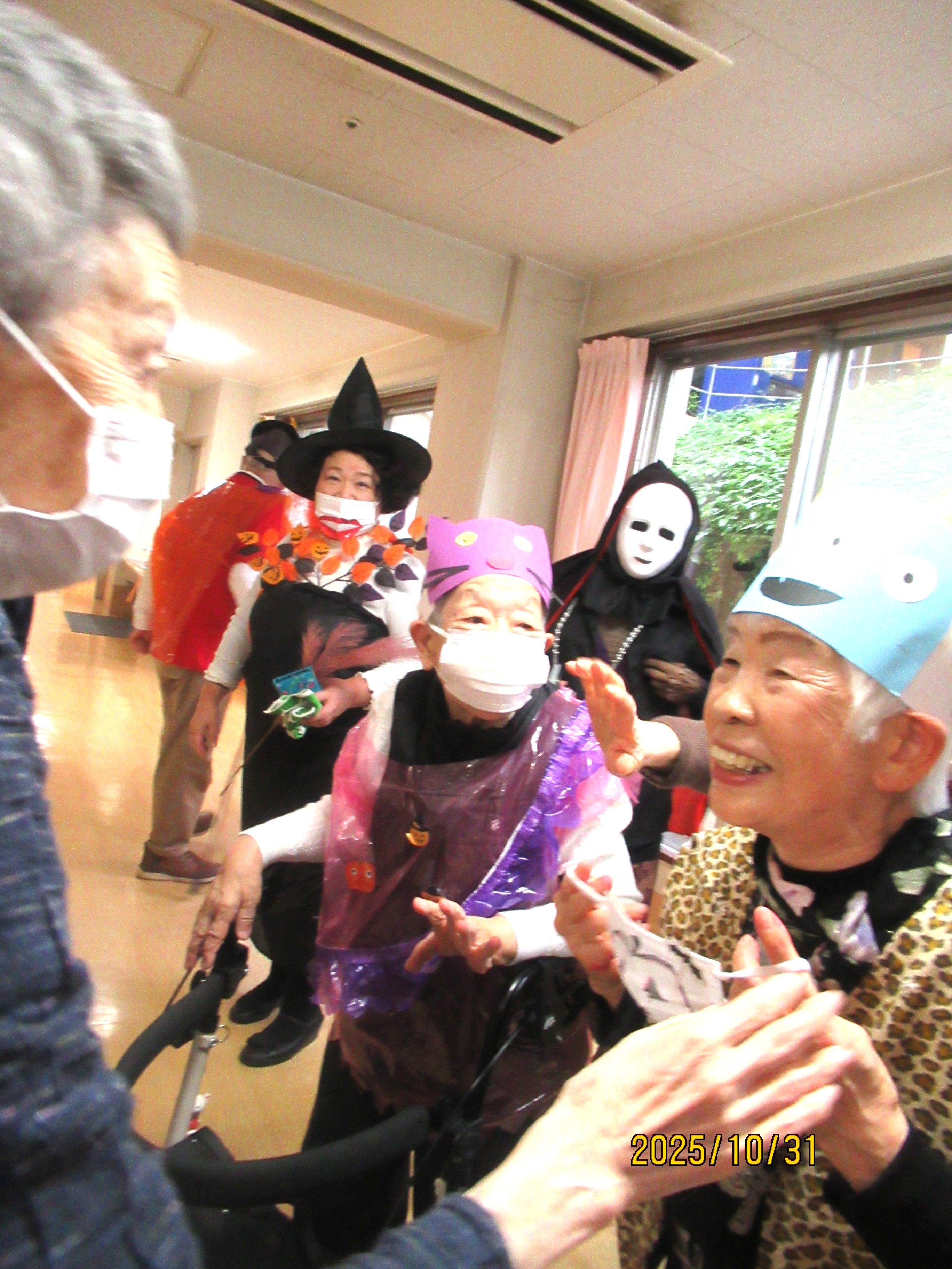 新着情報 NEWS 11月の彩風苑| ケアハウス 辰巳彩風苑 2025.11.30 11月の彩風苑は、10/31のハロウィンから始まります。 今年はあいにくの天気でした。雨が降る前に、たつみの森に車で向かいました。すると「中まで入って」と言われ、衣装のままデイの皆様に仲間入りをさせて頂きました。 雨がぽつぽつと降りだし、車で萬緑苑に移動します。歩ける方はそのまま行って頂きました。萬緑苑でも雨のため、苑内へ入らせて頂きました。 彩風苑から萬緑苑に移った方や、ご夫婦のどちらかが移られた方もいます。 久しぶりの再会を喜びました。 また、会いに来ますね! 今年も無事にハロウィンを敢行できましたね。 そして文化祭1日め11/3は、熊谷先生とたんぽぽの皆様です。西村さんも参加され、ウクレレを皆で弾いてくださり、熊谷先生のアルパの演奏もあり、聴いたり歌ったり、楽しく過ごすことが出来ました。 文化祭2日めは珠峯会の皆様による演奏です。三味線や太鼓、歌です。 文化祭3日めは西村さんのギターと歌です。 文化祭4日めは、琴の音の皆様による演奏です。小さな琴で大正琴と言います。ヘルパーさんの川田さんも一緒に演奏されていました。 文化祭の展示も素敵でした。 また来年、文化祭を楽しみましょう(o^―^o)ニコ 一覧に戻る