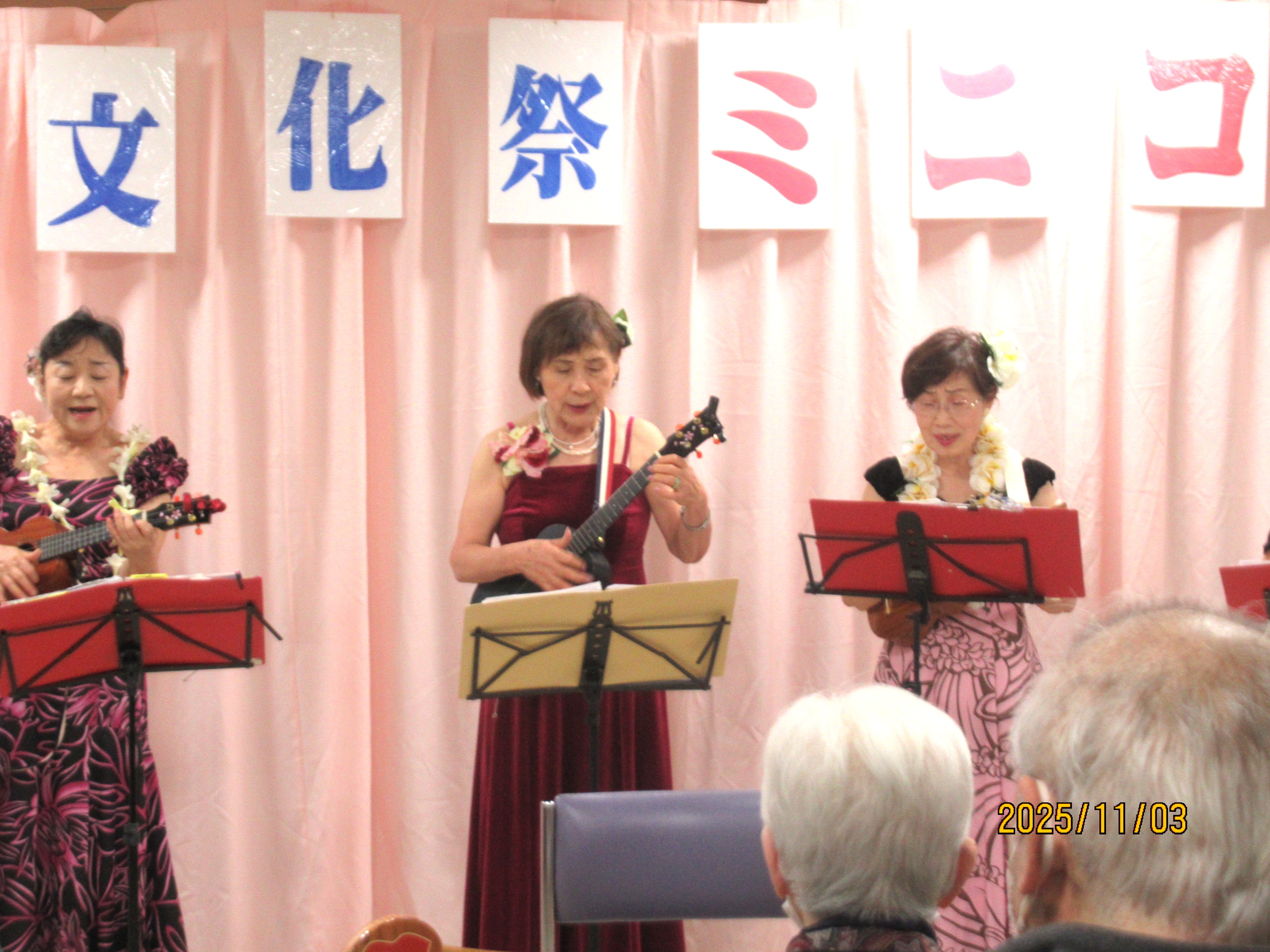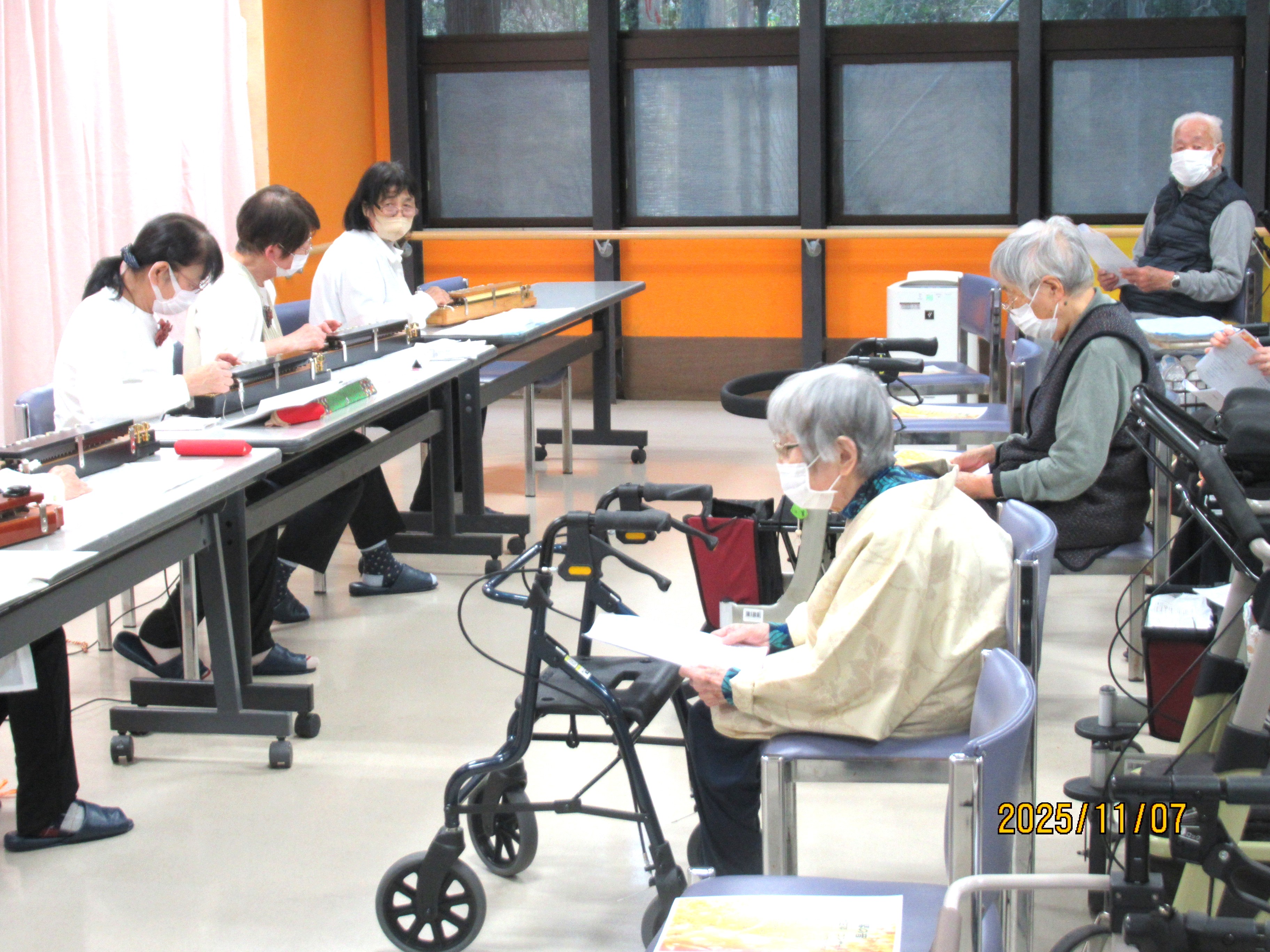 文化祭4日めは、琴の音の皆様による演奏です。小さな琴で大正琴と言います。ヘルパーさんの川田さんも一緒に演奏されていました。